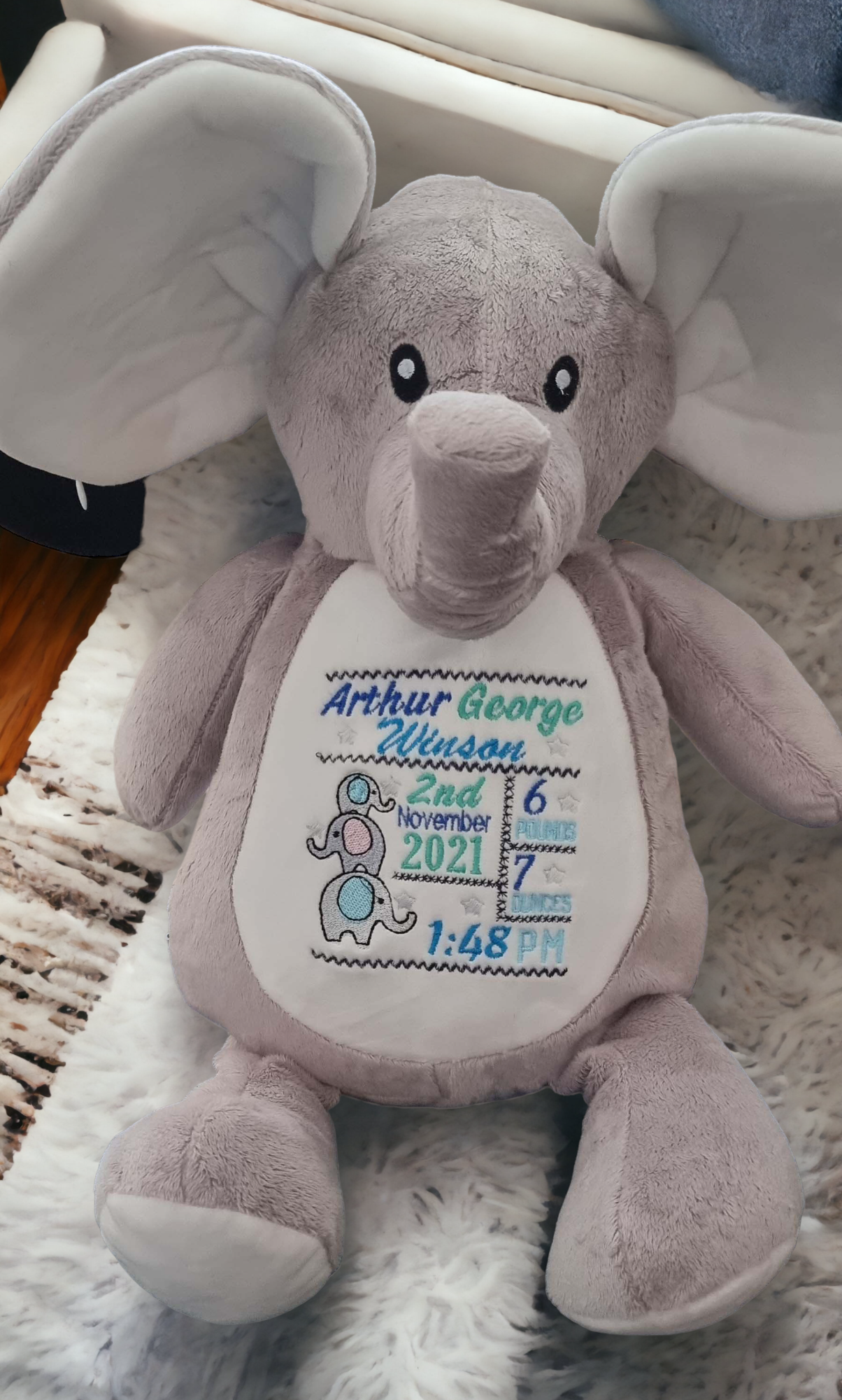 I can be embroidered with any Name, Message or if you are buying me for a new born you can have their Birth Date, Weight & Time of Birth.